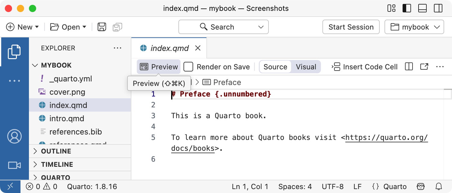 quarto preview mybookThe book preview will open in a new web browser. As you edit and save index.qmd (or other files like intro.qmd) the preview is automatically updated.